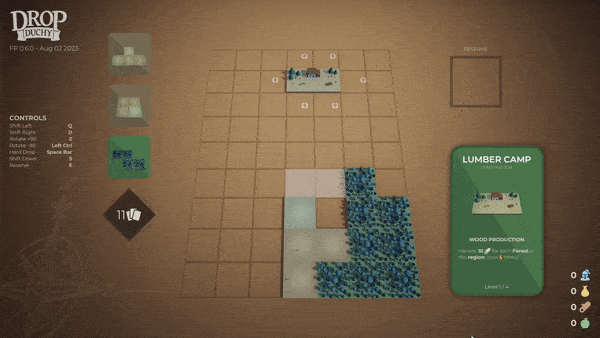 Once you figure out your promise, your next job is to make players feel it immediately. Players should visualize the core fantasy in a single screenshot, in the opening shot of the trailer, and in the first 10 minutes of gameplay. The GIF of Drop Duchy that I was sending to publishers in my pitch email showed sliding a Lumber Camp tile to gather wood from forest, which tells everything there is to know about the game.