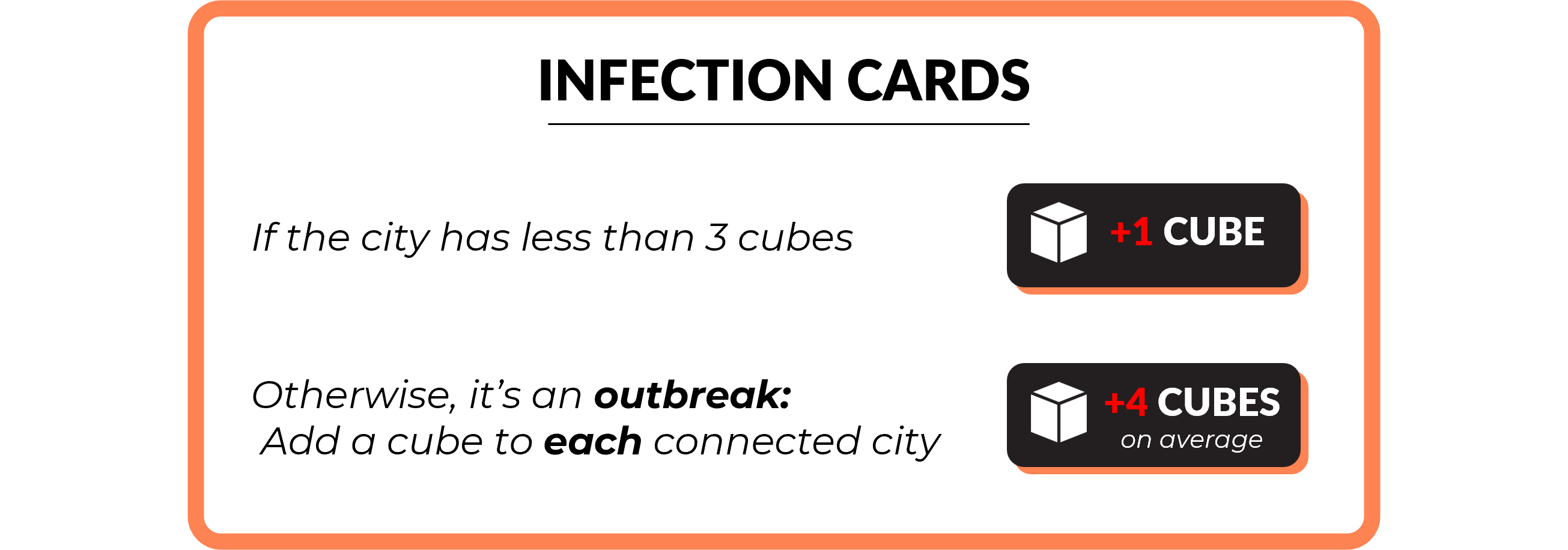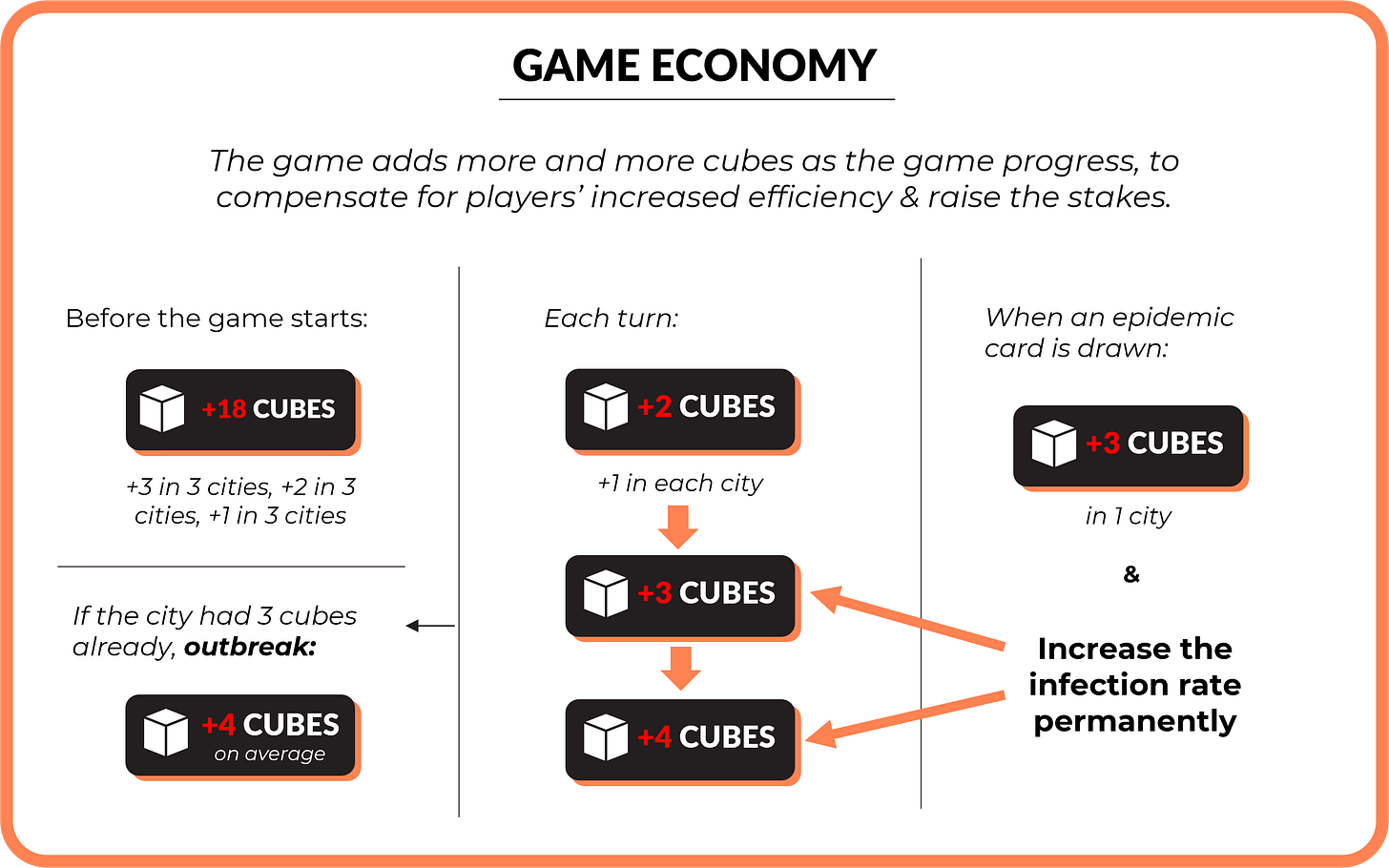 The mechanic is essential to the rhythm & tension of the game. Because of it, players can’t “play with fire” and let the board fill with cubes: they have to be proactive about the threat, take calculated risks, and be ready for the upcoming epidemic cards which will disrupt their plans and put them on the brink of disaster.