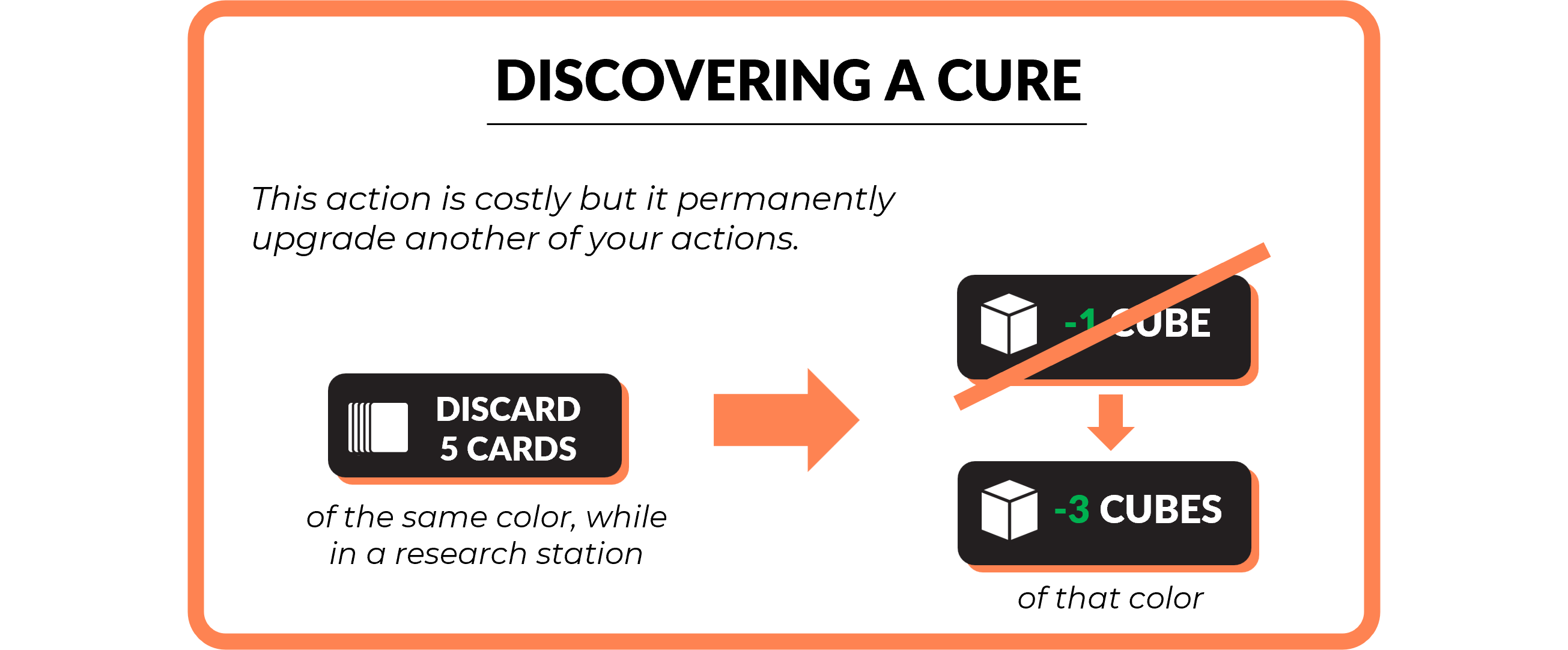 Discovering a cure is also a way to improve your efficiency: once a disease has a cure, it takes a single action to remove all cubes in your city (instead of one cube per action). So, discovering cures both brings you closer to winning and improves your action economy. Fantastic!*