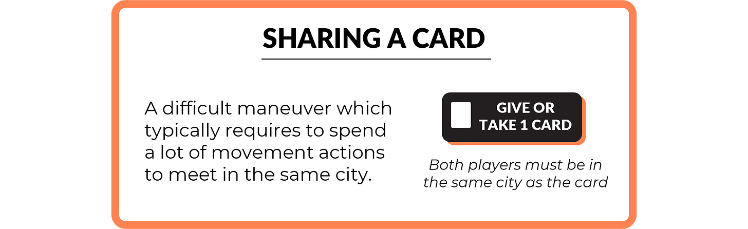 However, since you only draw two cards per turn, collecting five of one colour through sheer luck isn’t very likely. You typically need to rely on yet another action called “Share Knowledge” to trade with your partners. To perform this manoeuvre, two players need to meet in a city to exchange the card of that city.