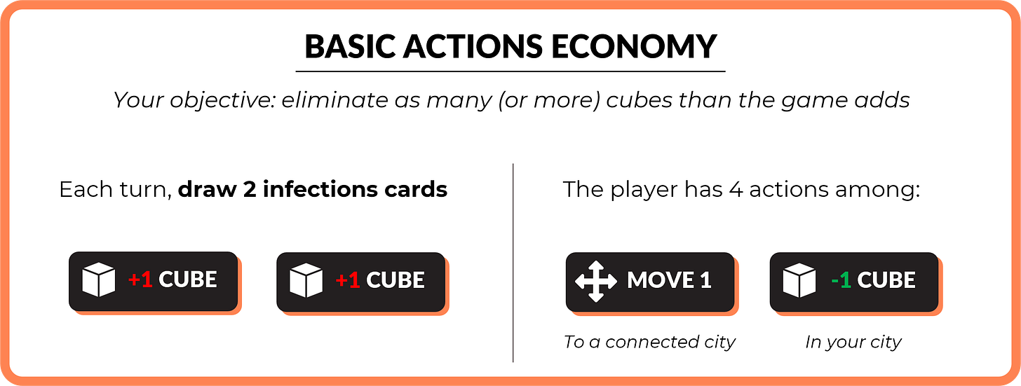 During their turn, each player gets four actions to spend how he wants. The most frequent are 1) moving their pawn to a connected city and 2) removing one cube from their city.