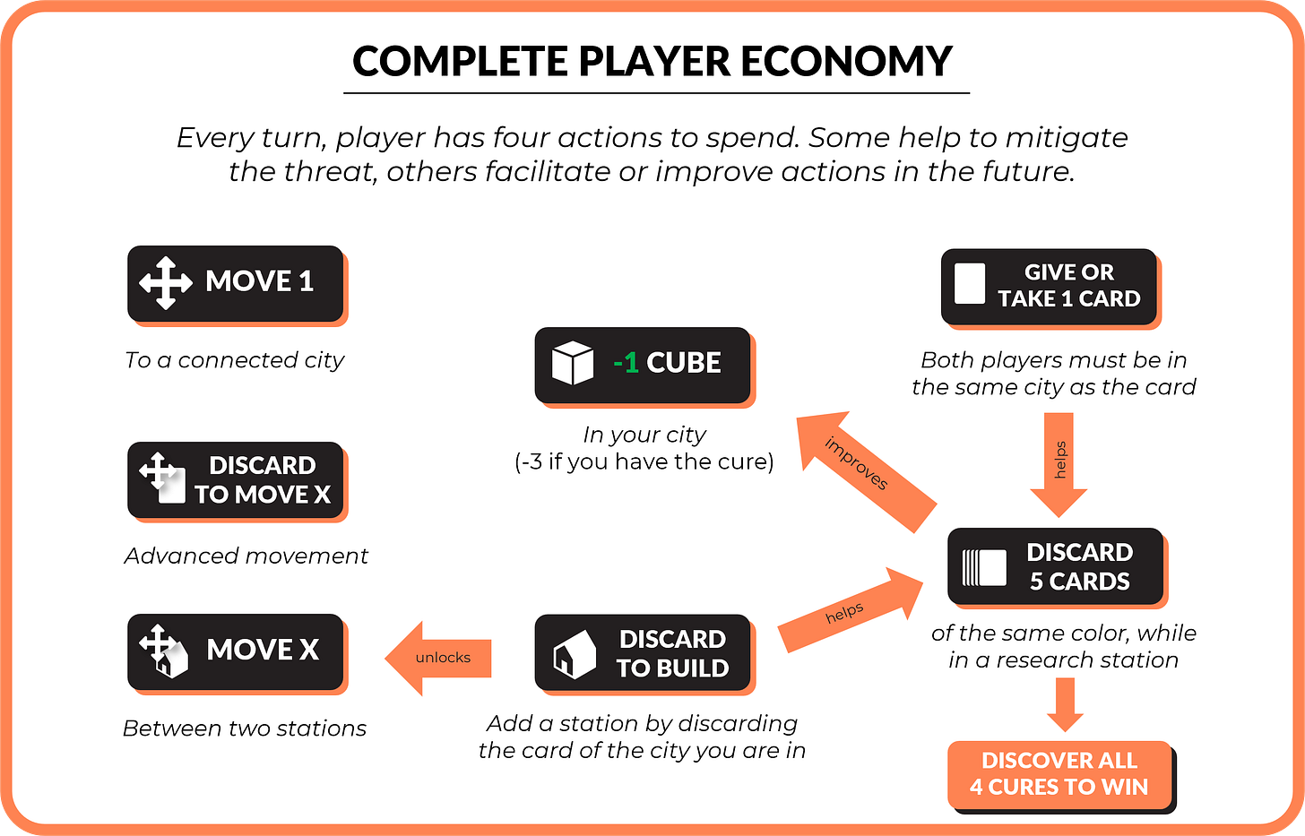 In a nutshell, to win a game of Pandemic, the group must find the right balance between spending actions to control the immediate threat and “investing” actions to improve your odds of surviving (and eventually winning). In other words: you try to avoid losing now while working towards future victory.